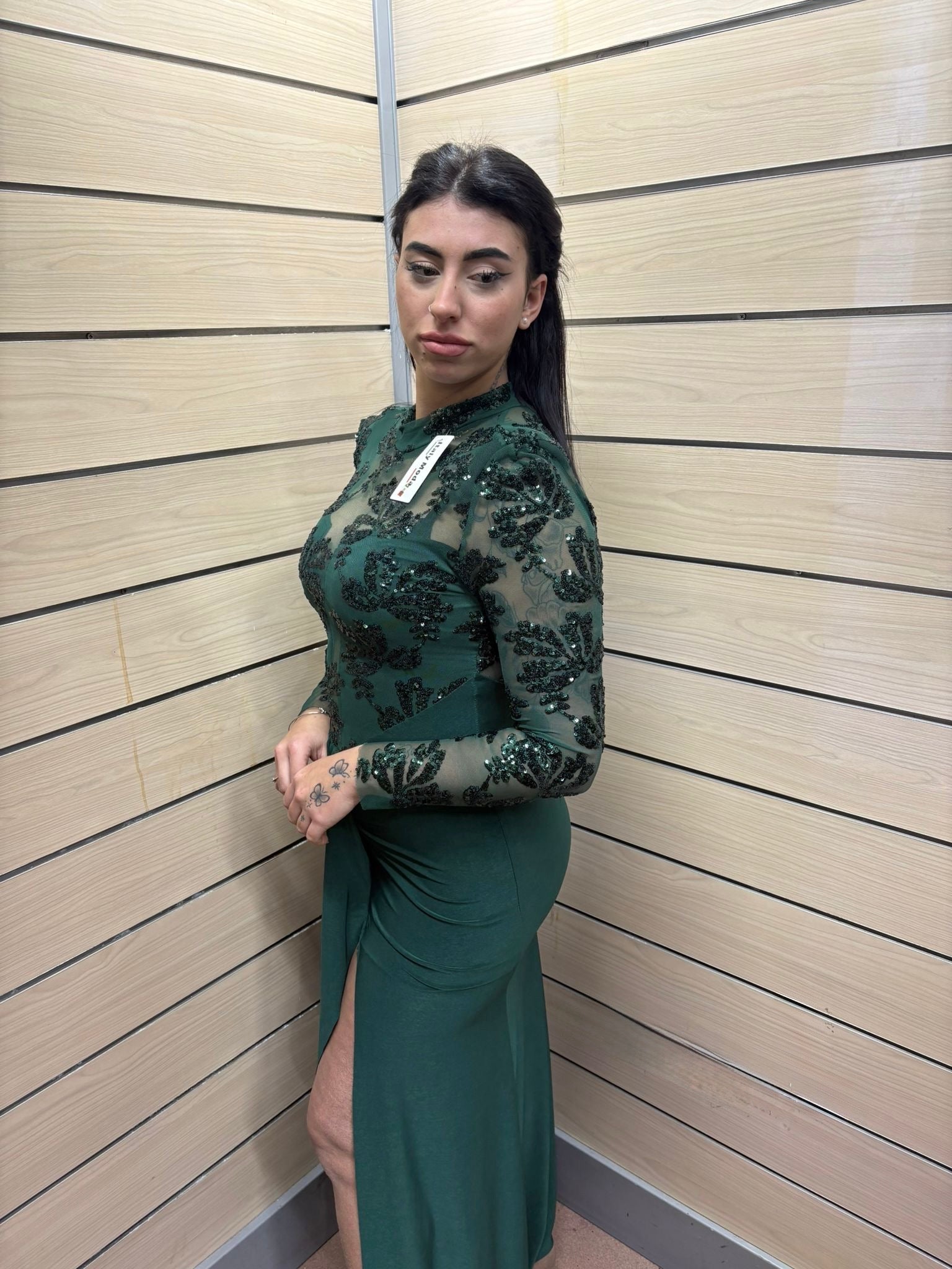 Sia la protagonista dei tuoi eventi più importanti con questo sontuoso abito lungo in verde smeraldo. Un connubio perfetto tra audacia e sartorialità, questo capo è pensato per chi desidera un'eleganza sofisticata arricchita da dettagli luminosi e una silhouette scultorea.