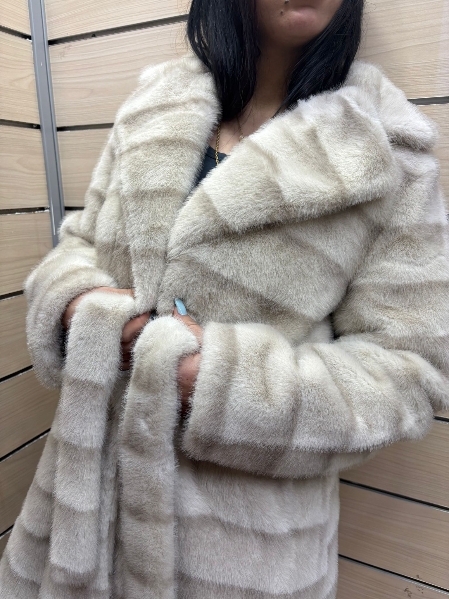 Cappotto Lungo Eco Pelliccia Beige Effetto Visone