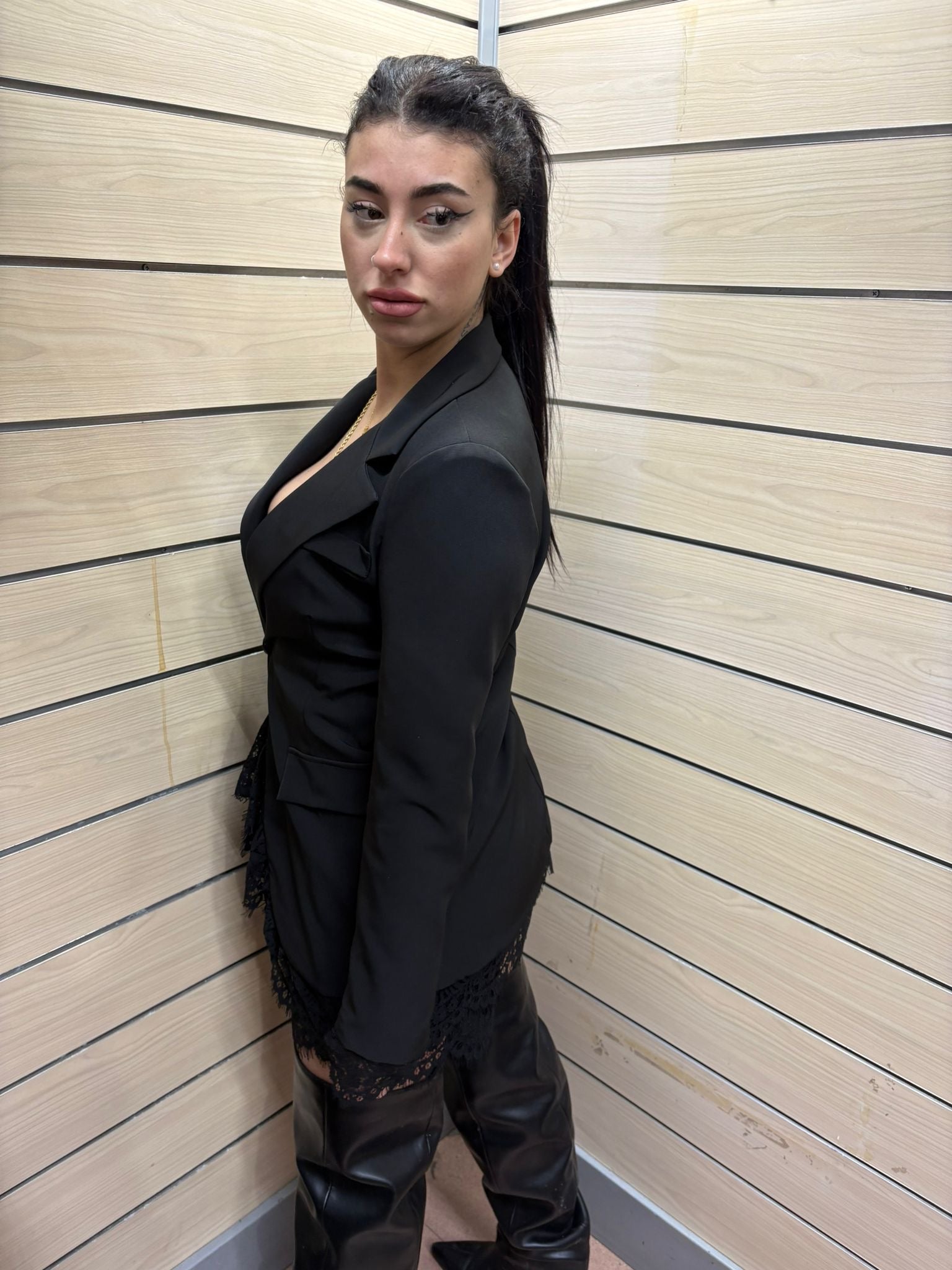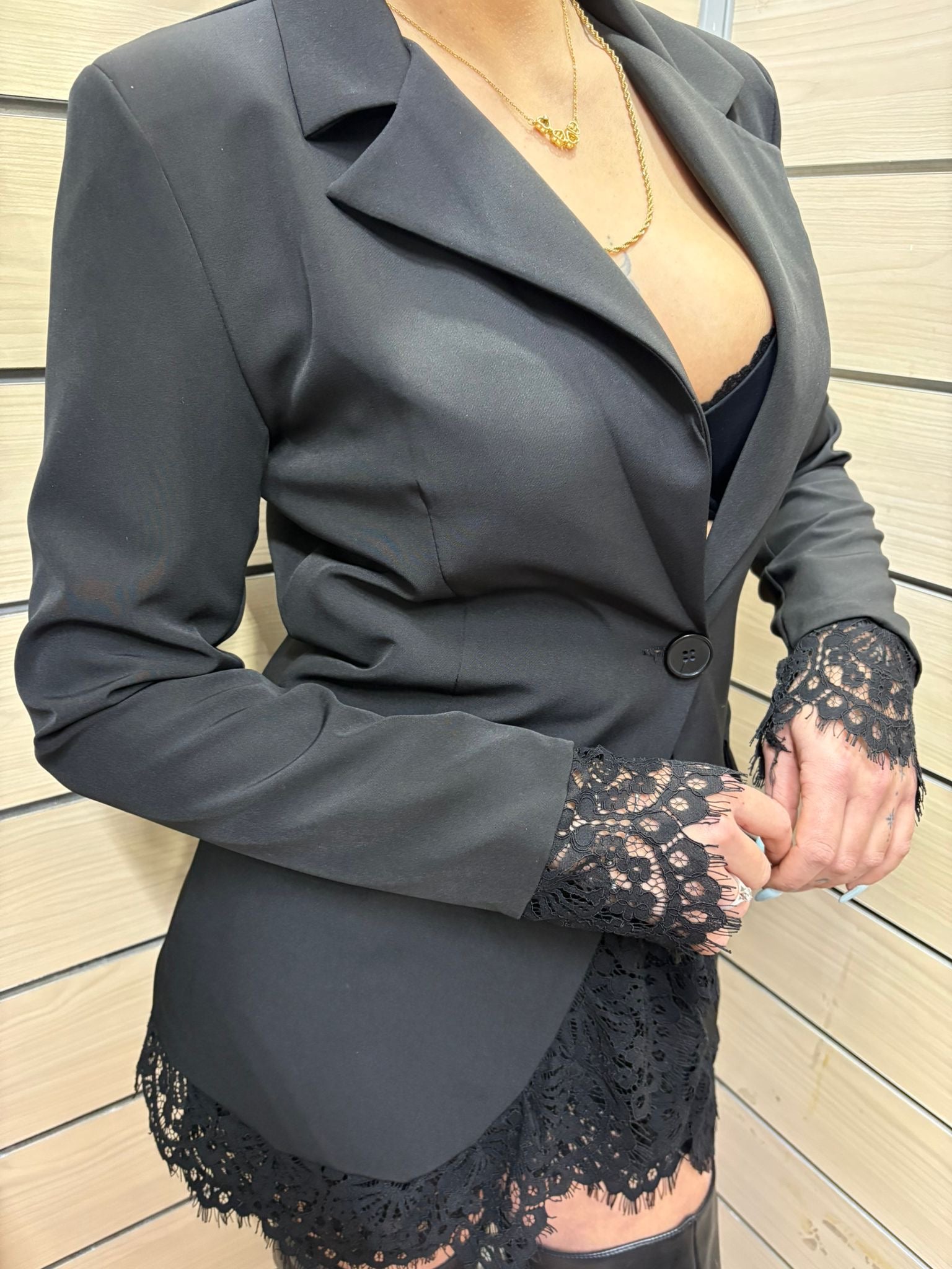 Perfetto per occasioni serali eleganti, eventi formali o aperitivi chic. Il contrasto tra la struttura rigorosa del blazer e la delicatezza del pizzo crea un equilibrio sofisticato tra rigore e sensualità. Ideale abbinato a stivali alti per un look deciso e contemporaneo.