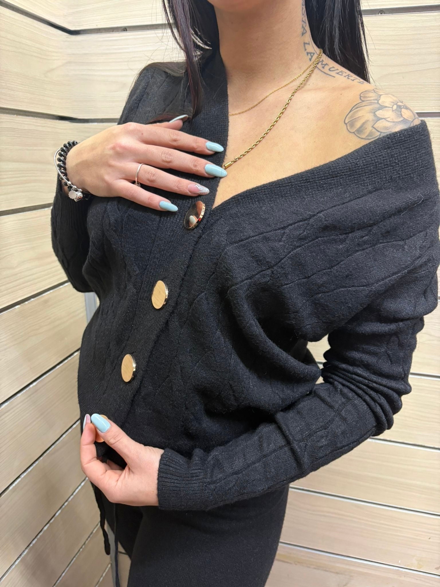• Cardigan Iconico: Caratterizzato da una classica lavorazione a trecce frontale che dona texture e tridimensionalità. Lo scollo a V profondo e la chiusura con bottoni gioiello dorati aggiungono un tocco di luce e ricercatezza al capo.