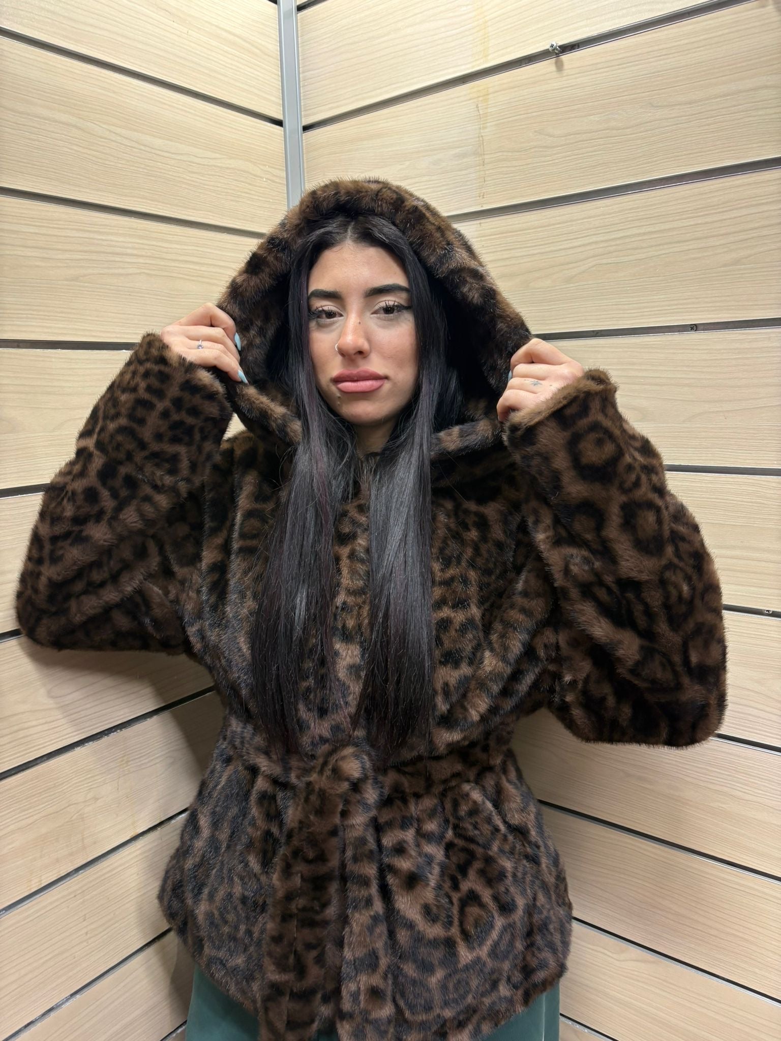 Giacca Eco Pelliccia Animalier con Cappuccio e Cintura