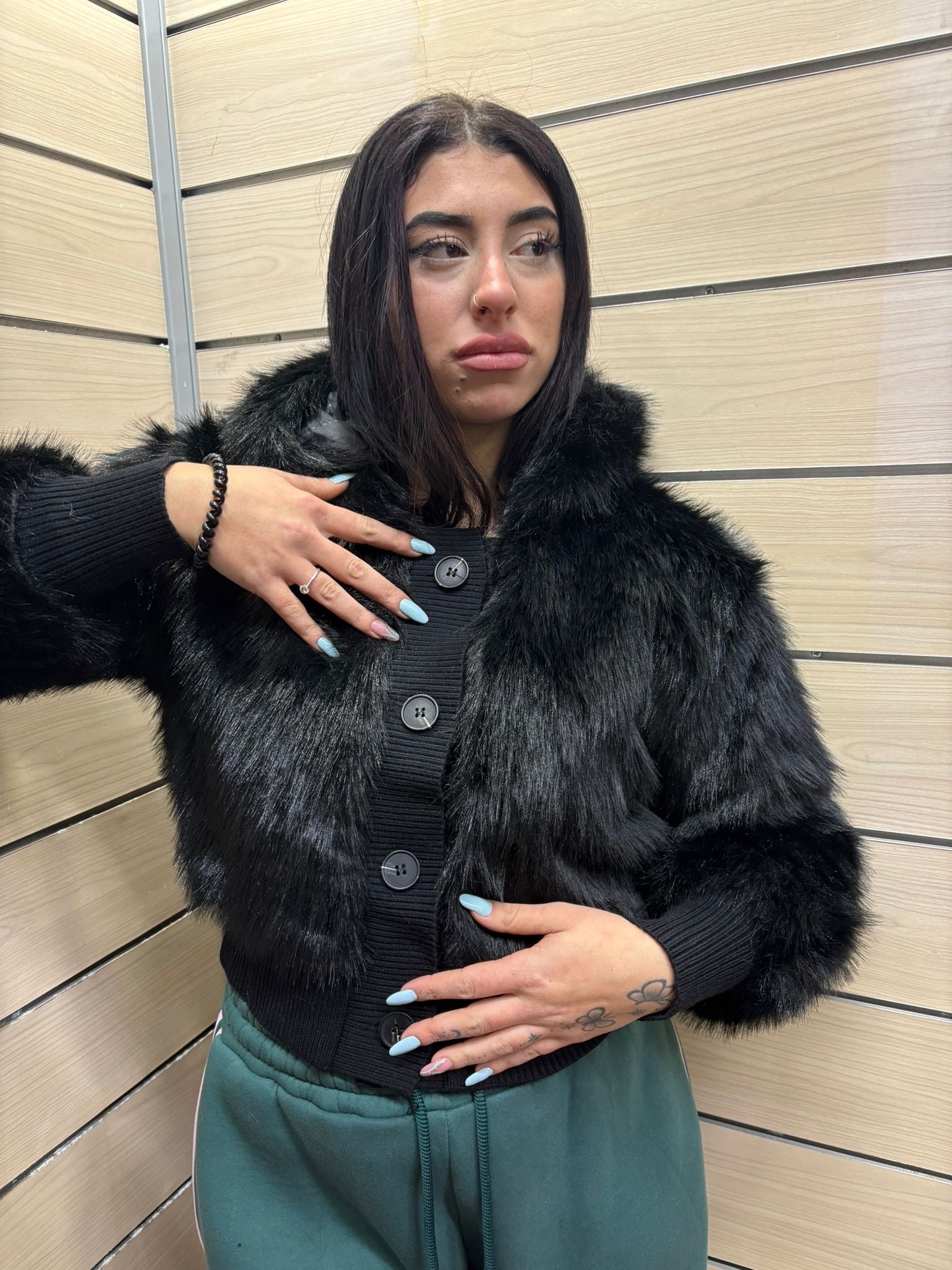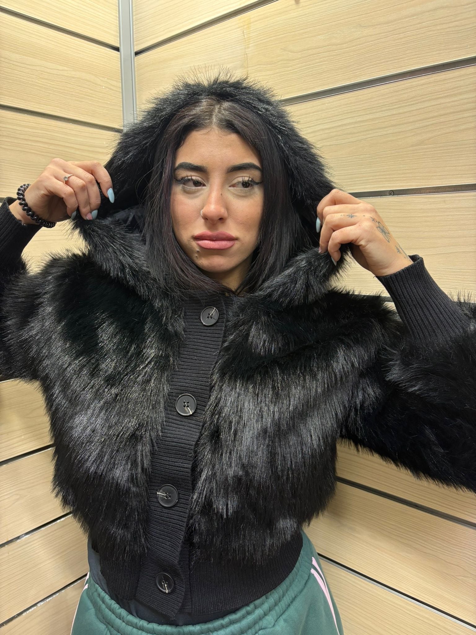 Un capo dal carattere deciso e glamour, questa giacca corta in eco pelliccia a pelo lungo è pensata per chi ama distinguersi con stile. Il design moderno e il cappuccio generoso la rendono perfetta per affrontare il freddo con eleganza urban-chic, trasformando ogni outfit in una dichiarazione di moda.