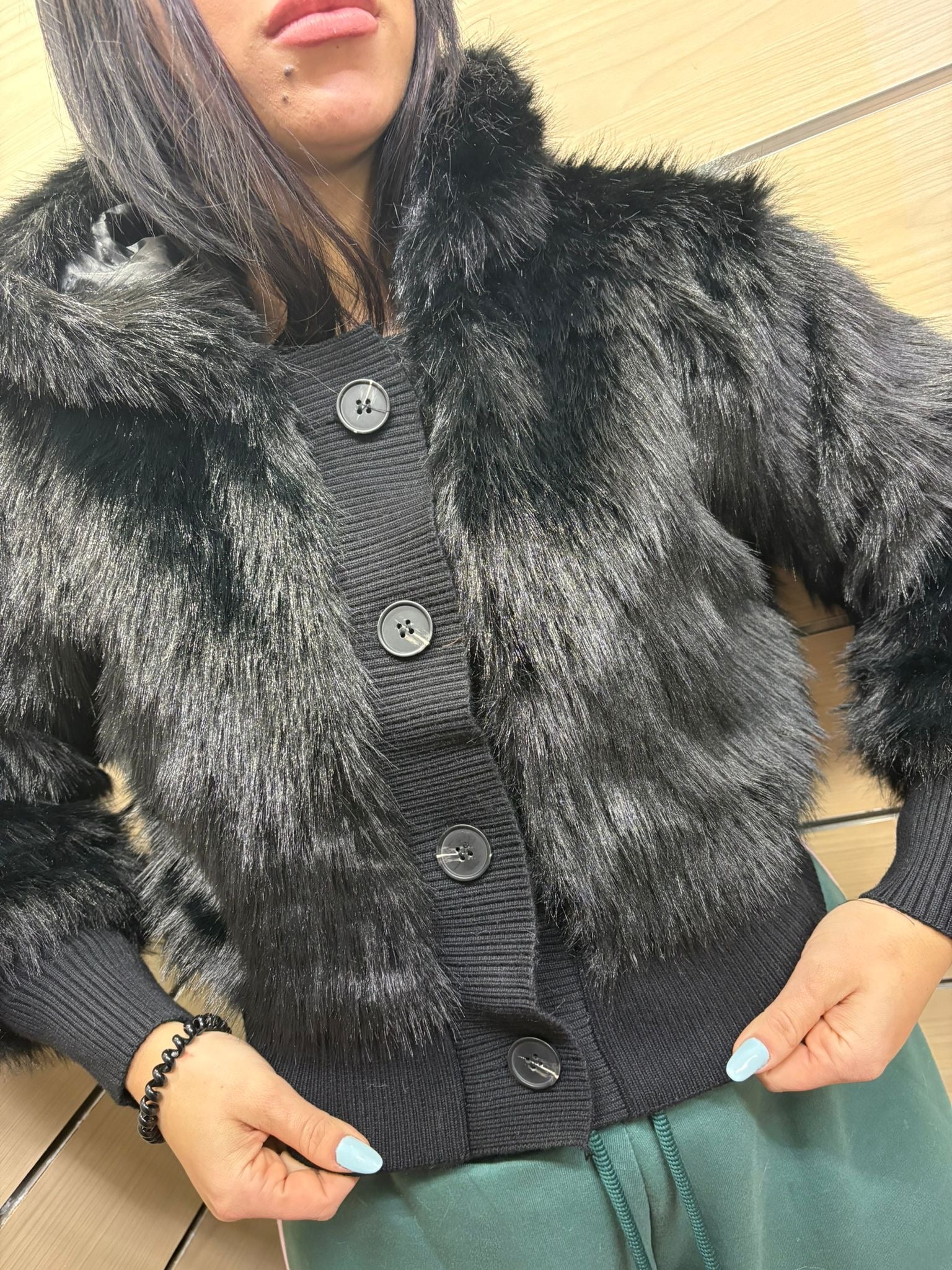 • Design: Taglio corto, cappuccio ampio e avvolgente, chiusura frontale con bottoni neri, inserti a costine su bordi e polsini